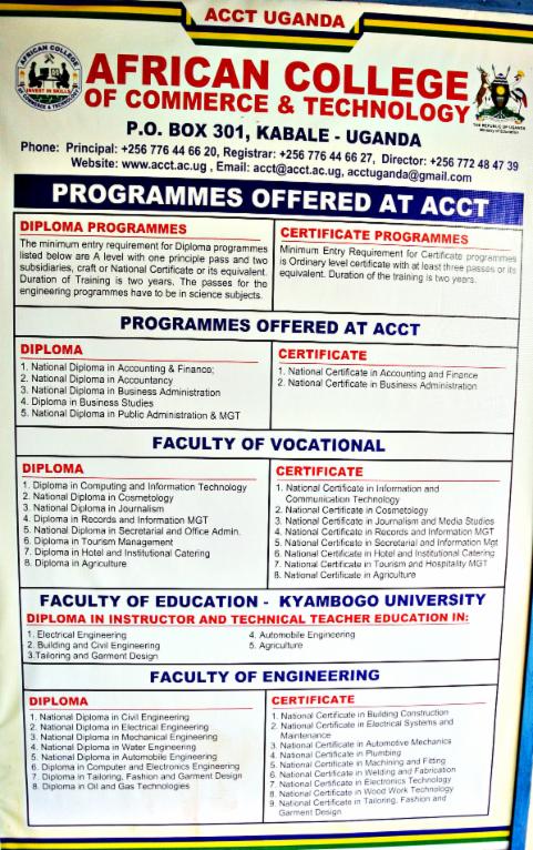 3. African College of Commerce. The institution is registered with the Ministry of Education and Sports and is Licensed by the National Council for Higher Education NCHE, to examine and award its students with certificates and Diplomas which are recognized by the government of Uganda